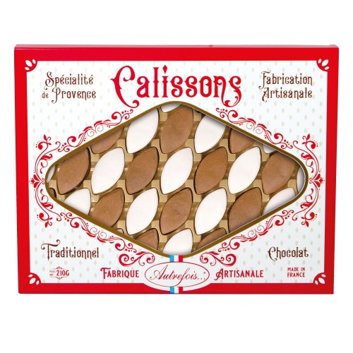 Duo de Calissons de Provence au doux mélange d'amandes, de melons et d'écorces d'oranges confites, et au chocolat, dans une belle boite décorée.
