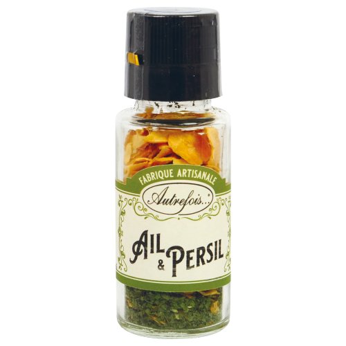 Voici un petit moulin avec un mélange de persil et d'ail, classique incontournable pour assaisonner vos salades de tomates ou pour préparer un beurre maître d'hôtel.
