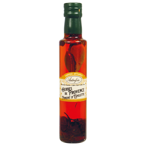 Dans une jolie bouteille à la base carrée qui s'arrondit vers le haut, notre huile d'olive vierge extra* est parfumée d'herbes de Provence, de petits piments oiseau et de poudre de piment d'Espelette. Elle relèvera vos plats, pizzas et salades.
