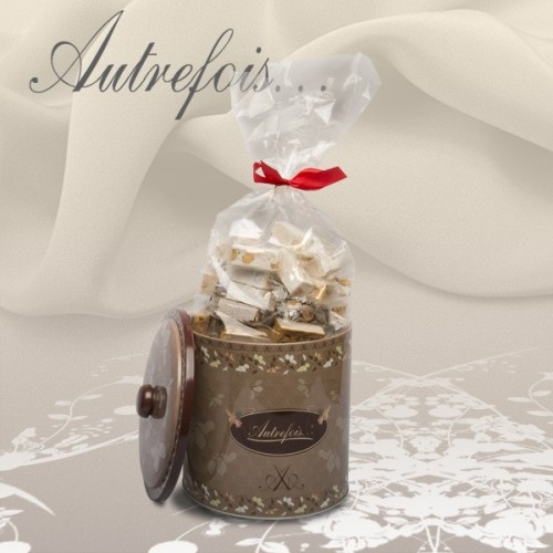 Une jolie boite décorée avec déshumidificateur incorporé à collectionner, remplie d'un assortiment de bouchées de nougats aux parfums de miel, d'oranges confites, de noisettes, de caramel, de noix et café. Une confiserie à l'ancienne pour retrouver le plaisir du vrai nougat.