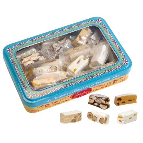 Optez pour cette jolie boite décorée à collectionner, remplie de délicieuses bouchées de nougats aux parfums de miel, d'oranges confites, de noisettes, de caramel, de noix et de café. Cet assortiment de saveurs vous propose de retrouver le plaisir du vrai nougat. Découvrez cet assortiment de saveurs à partager autour d'une table entre amis et familles. Cette boîte est parfaite pour offrir à un de vos proches.