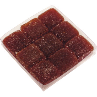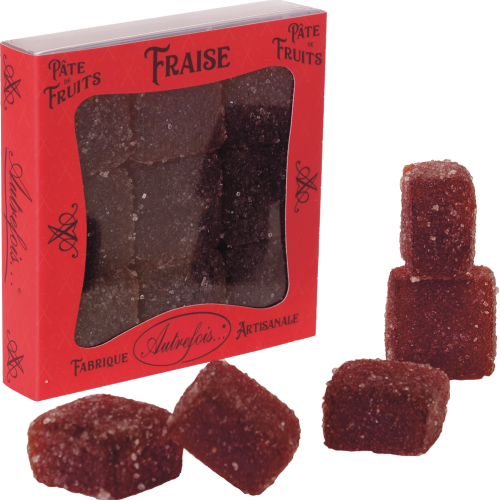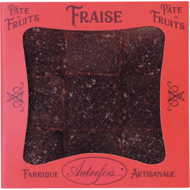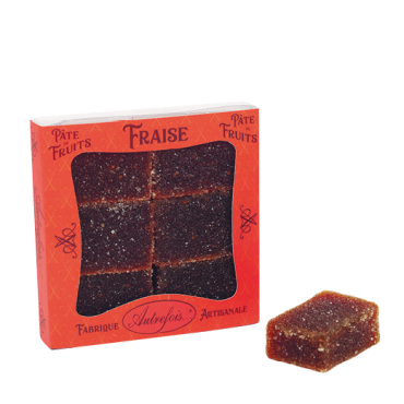 De la Pâte de Fruits à la pulpe de Fraises et à la Vanille Bourbon joliment présentée dans son étui de 6 (ou 9) pâtes de fruits.