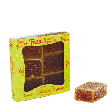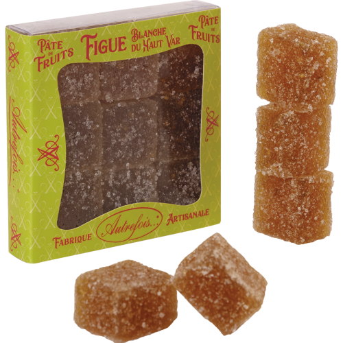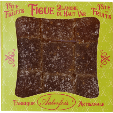 La vraie pâte de fruit, c'est chez Autrefois... Ici de la pulpe de figue blanches du Haut-Var parfumée de vanille Bourbon. Le tout dans un petit coffret de 6 Pâtes de Fruits "Pur Fruit" : à consommer sans modération.