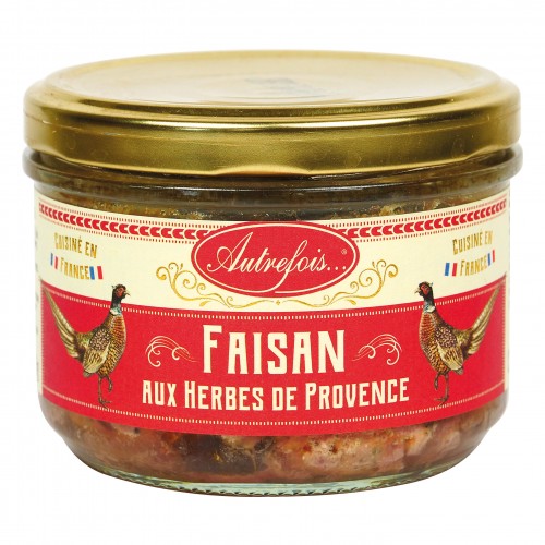 Ingrédients : gorge de porc, faisan 22%, foie de porc, vin rouge (sulfites), œufs entiers, sel, herbes de Provence 0,27% (thym, romarin, sarriette, origan), poivre, 4 épices. Porc origine France